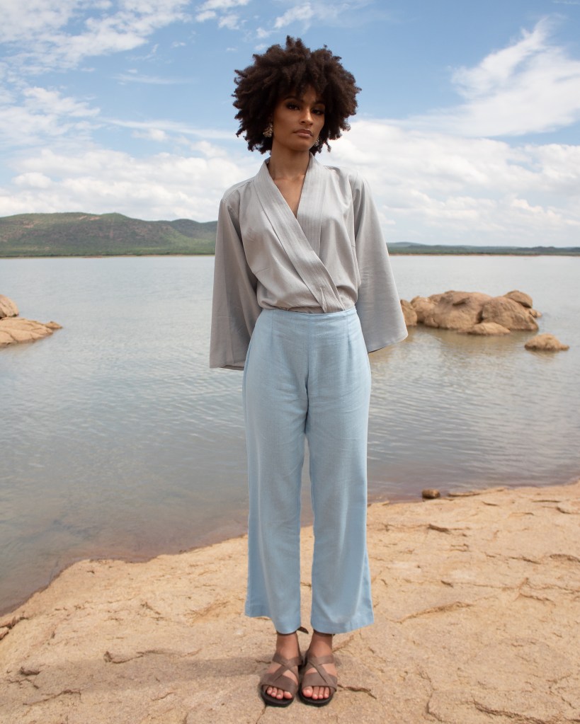 80% linen + 20% raime & A straight tailored elasticated slack pant. Made from locally-sourced and sustainable linen. “Motlelepula” means “the one who comes with the cloud rain” in Setswana. 80% linen + 20% raime