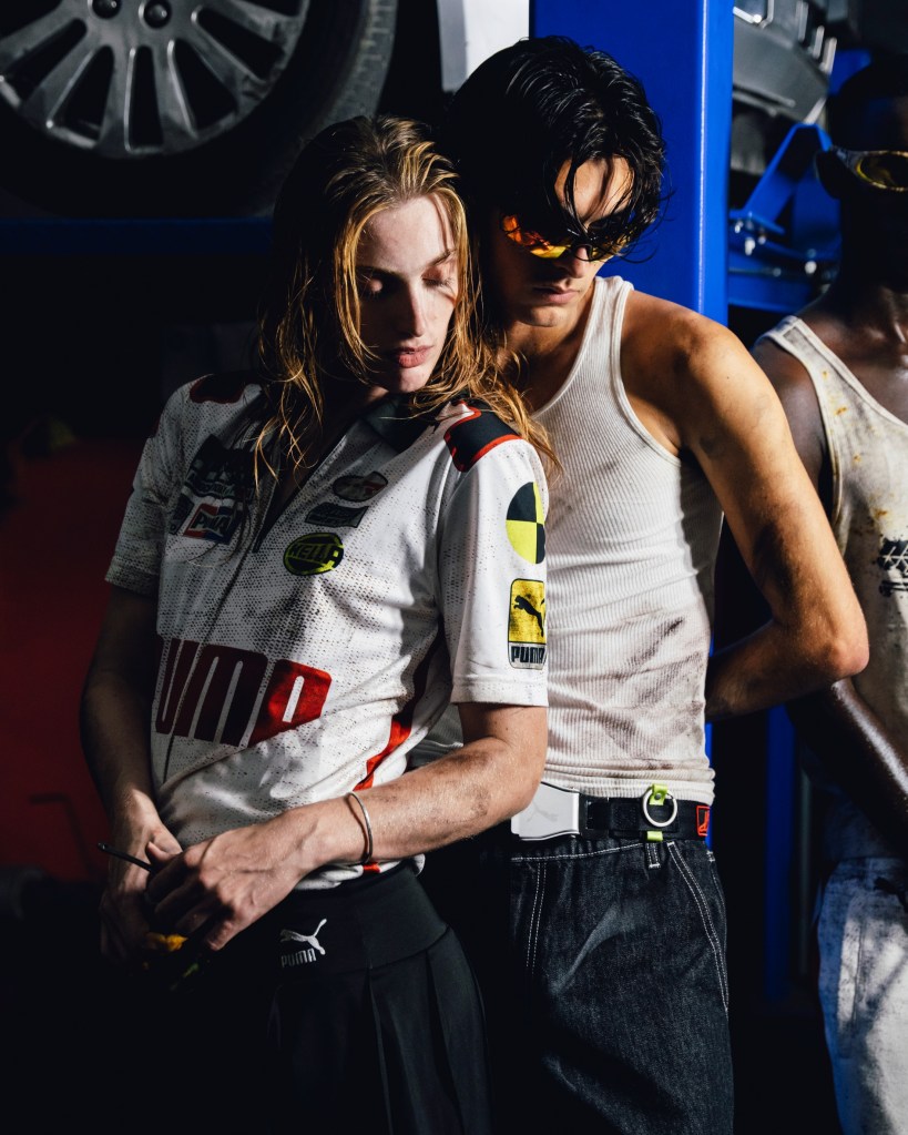 • A$AP ROCKY X PUMA TANK TOP: This tank stands out with a puff-printed PUMA Cat Logo with tire marks at the chest, plus AWGE branding at the back. It features a loose fit and a distressed treatment as if it’s been worn in the garage all day.