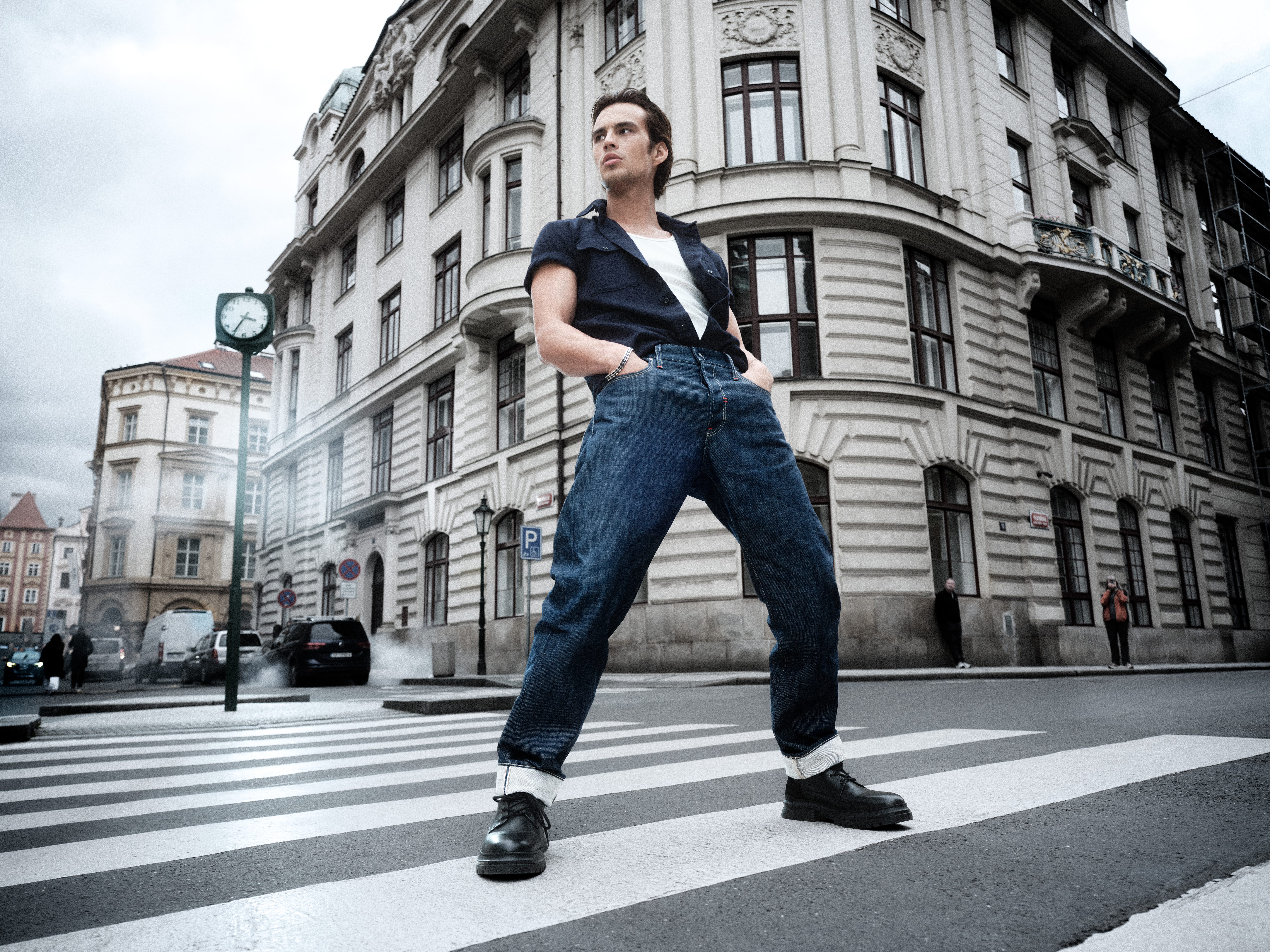 Polman. With denim at its center, low camera angles and sharp perspectives amplify the